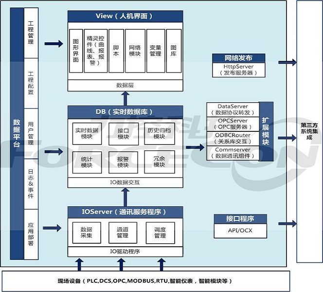 ForceControl監控組態軟件功能架構的核心是分布式區域實時數據庫,其它應用程序或者功能模塊通過與區域實時數據庫交互而實現其功能及擴展。軟件的主要功能模塊包括實時數據庫、設備通訊服務程序、HMI畫面、網絡通訊程序、接口SDK、Web應用服務、關系數據轉儲、數據轉發、擴展組件等幾個部分。