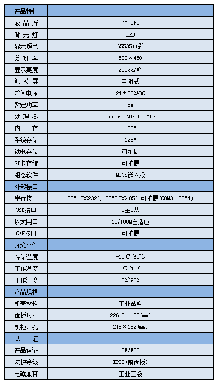TPC7062Ti,是一套以先進的Cortex-A8 CPU為核心(主頻600MHz)的高性能嵌入式一體化觸摸屏。該產品設計采用了7英寸高亮度TFT液晶顯示屏(分辨率800×480),四線電阻式觸摸屏(分辨率4096×4096)。同時還預裝了MCGS嵌入式組態軟件(運行版),具備強大的圖像顯示和數據處理功能。